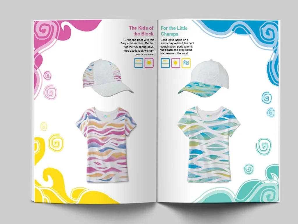 To create an apparel brand inspired on the weather. The line includes items such as shoes and shirts for children and they are designed with colorful wavy patterns that look stylish and free spirited. The Cool Kids brand was created for those who are not afraid to rock their favorite color while becoming conscious about their environment.